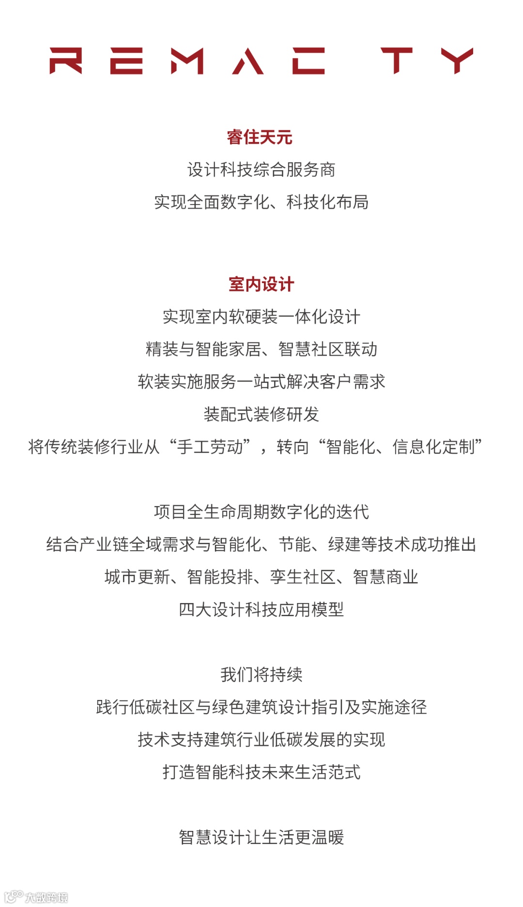 睿住天元作为设计科技综合服务商,秉承“智慧设计让生活更温暖”理念,实现全面数字化、科技化布局,提供全过程全专业设计咨询及一体化的设计与服务。