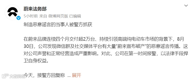 9月5日,蔚来法务部官方微博发文称,8月30日,发现