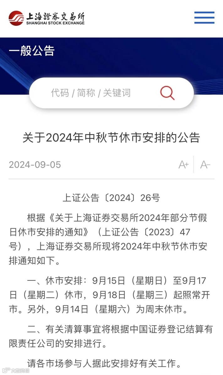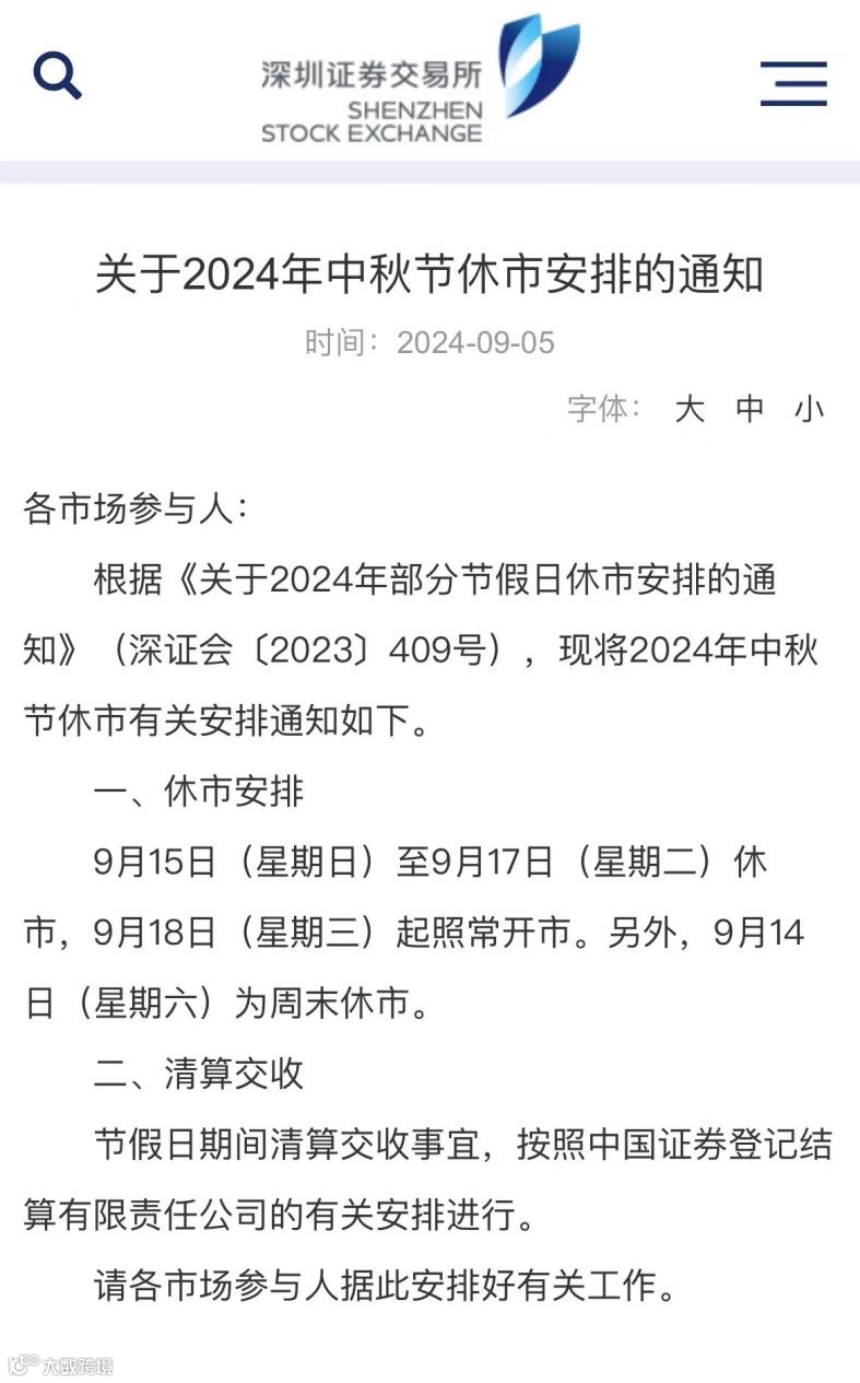 9月5日,沪深北交易所发布2024年中秋节休市安排。