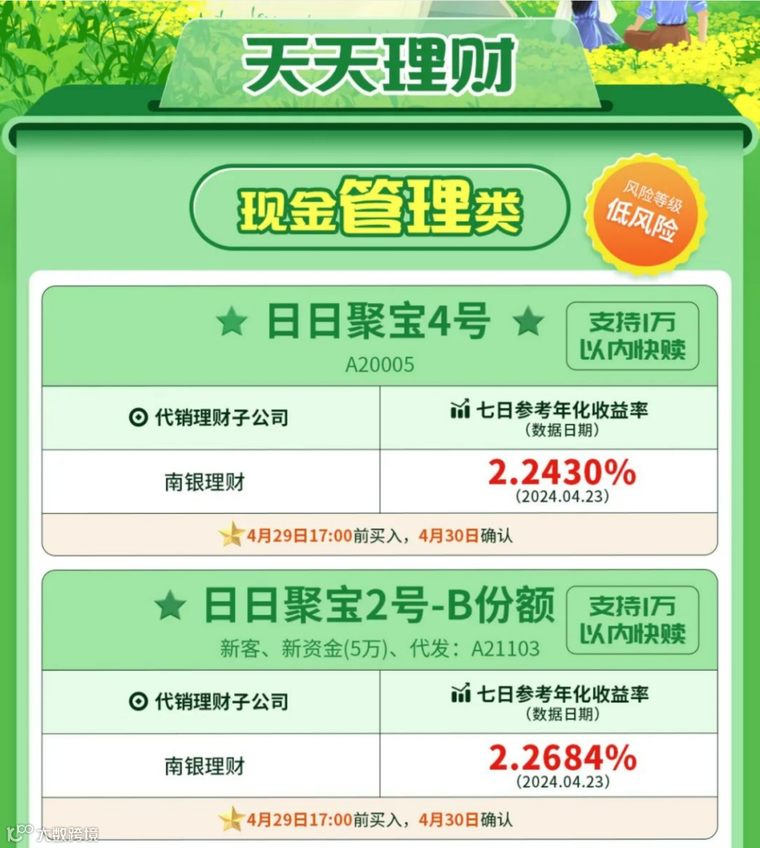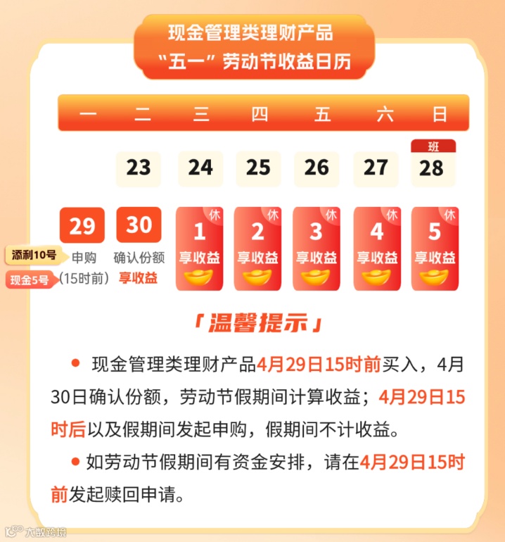 投资者若有意购买现金管理类理财产品或货币基金,并希望能在五一假期期间获得收益,请在4月29日交易时间结束前完成购买,确保在4月30日份额得到确认。但需注意,不同产品的“交易时间”结束时点有所差异,因此在进行具体操作时,建议投资者仔细阅读各产品的说明。