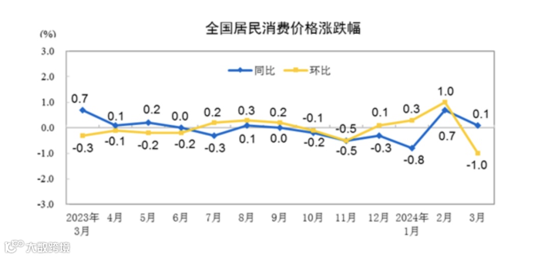 3月全国CPI(居民消费价格指数)同比上涨0.1%