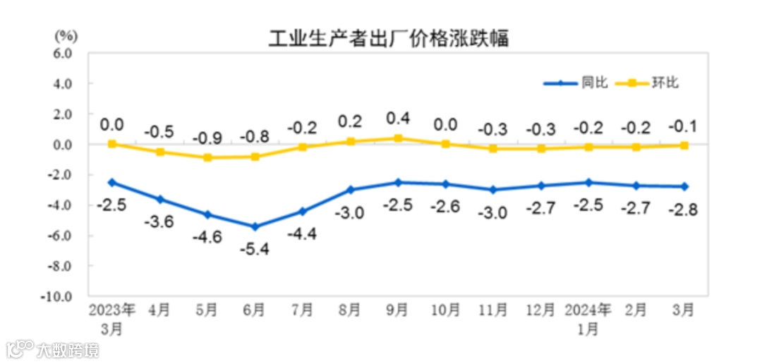 董莉娟分析,3月,随着节后工业生产恢复,工业品供应相对充足,全国PPI环比下降0.1%,降幅比上月收窄;同比下降2.8%,降幅略有扩大。