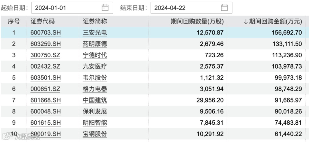 图为2024年股票回购金额排名前十个股(截至4月22日18时)