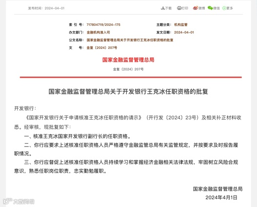 4月1日,国家金融监督管理总局发布了关于开发银行王克冰任职资格的批复,核准王克冰国家开发银行副行长的任职资格。