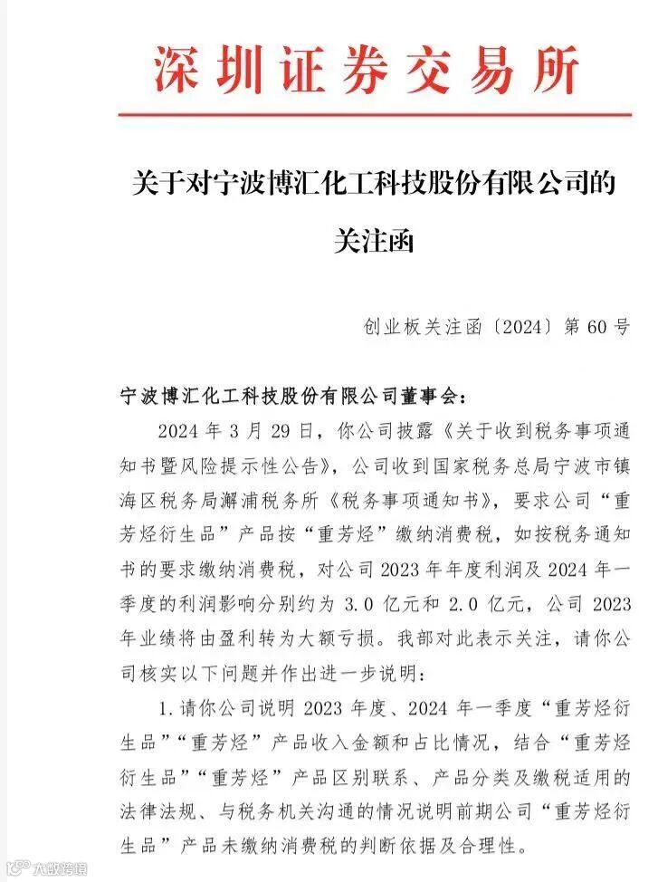 4月1日,博汇股份收到深交所关注函,要求公司说明2023年度、2024年一季度“重芳烃衍生品”“重芳烃”产品收入金额和占比情况,结合“重芳烃衍生品”“重芳烃”产品区别联系、产品分类及缴税适用的法律法规、与税务机关沟通的情况,说明前期公司“重芳烃衍生品”产品未缴纳消费税的判断依据及合理性。