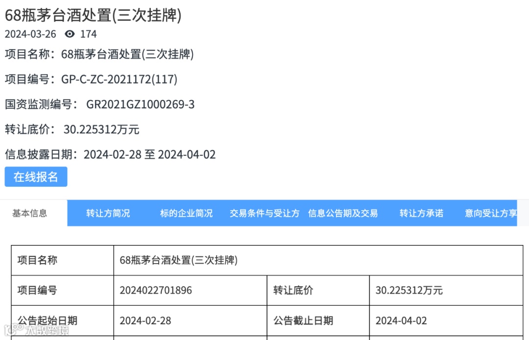 4月1日,记者在贵州阳光产权交易所有限公司官网看到,网站发布“68瓶茅台酒处置(三次挂牌)”公告。记者致电该交易机构,联系人张经理表示,前期挂牌均无人报价,后来交易机构调整交易条件,可能是做了降价处理,目前正在第三次挂牌期。“至于为何无人报价,这属于市场行为,我们也不太清楚。”张经理表示。