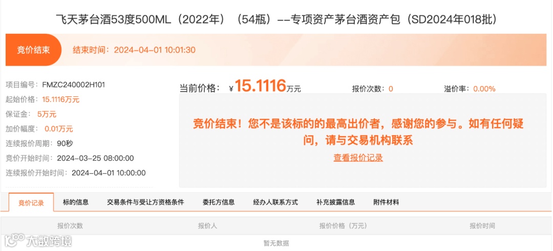 和本次山东产权交易中心挂牌飞天茅台酒无人报价情况相类似的,还有贵州阳光产权交易所有限公司挂出的68瓶处置茅台酒。