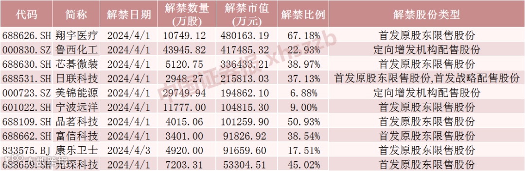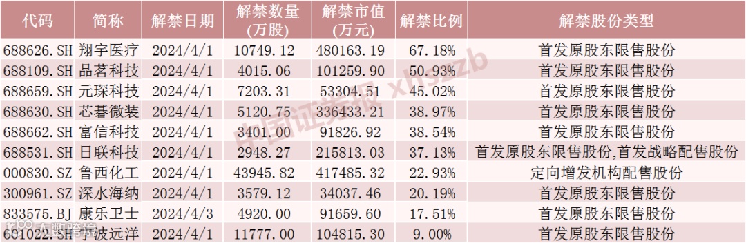 具体来看,Wind数据显示,翔宇医疗4月1日将解禁1.07亿股,均为首发原股东限售股份;鲁西化工4月1日将解禁4.39亿股,均为定向增发机构配售股份;芯碁微装4月1日将解禁5120.75万股,均为首发原股东限售股份。