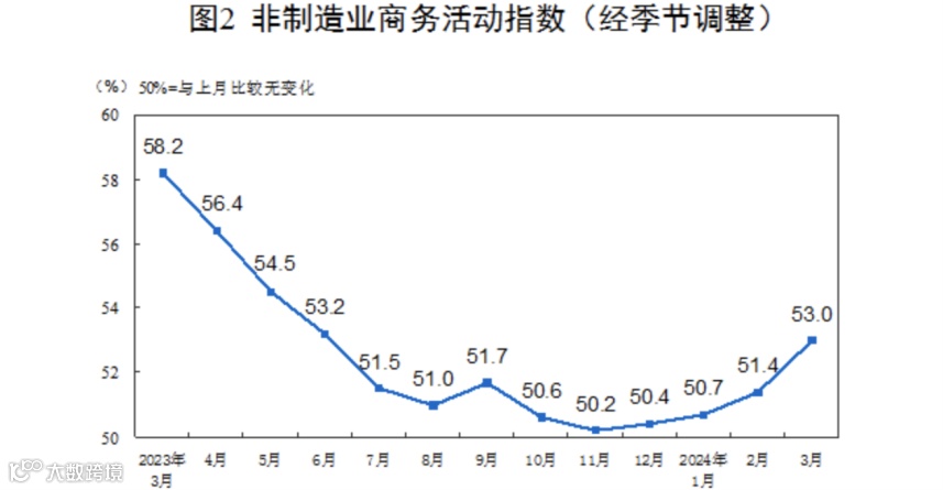 “3月,非制造业商务活动指数为53.0%,比上月上升1.6个百分点,非制造业景气水平持续回升。”赵庆河说。
