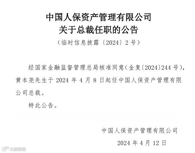 中国人保资产管理有限公司(简称“人保资产”)4月12日披露称,经国家金融监督管理总局核准同意,黄本尧于2024年4月8日起任中国人保资产管理有限公司总裁。