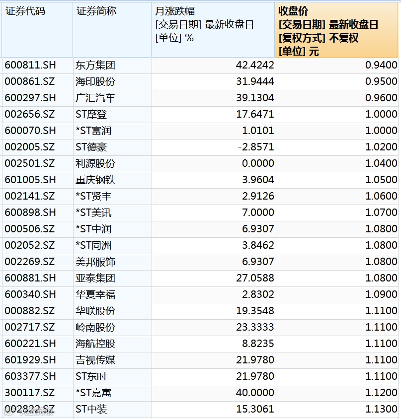 Wind数据显示,截至7月5日,7月以来的5个交易日中,东方集团累计上涨逾42%,连续4个交易日涨停;海印股份累计涨逾31%;广汇汽车累计涨逾39%。这3只股票的股价距离1元仅一步之遥。