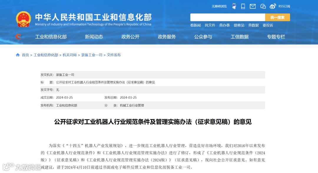 3月25日,工信部就《工业机器人行业规范条件(2024版)》(征求意见稿)(简称《规范条件》)和《工业机器人行业规范管理实施办法(2024版)》(征求意见稿)(简称《办法》)向社会公开征求意见。《规范条件》提出,鼓励工业机器人关键零部件、本体制造及集成应用企业按照本规范条件自愿申请规范条件公告,对符合规范条件的企业以公告的形式向社会发布,引导各类鼓励政策向公告企业集聚。