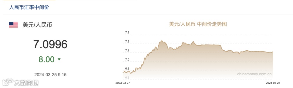外汇交易中心数据显示,3月25日,人民币对美元汇率中间价报7.0996元,较前一交易日调升8基点。3月以来,该中间价累计调升40个基点。