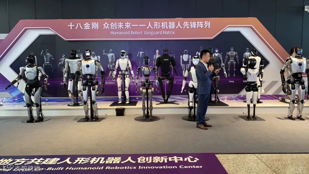 7月4日下午,在大会展区北侧入口不远处,多台来自不同企业的人形机器人整齐列队,迎接大会开幕。