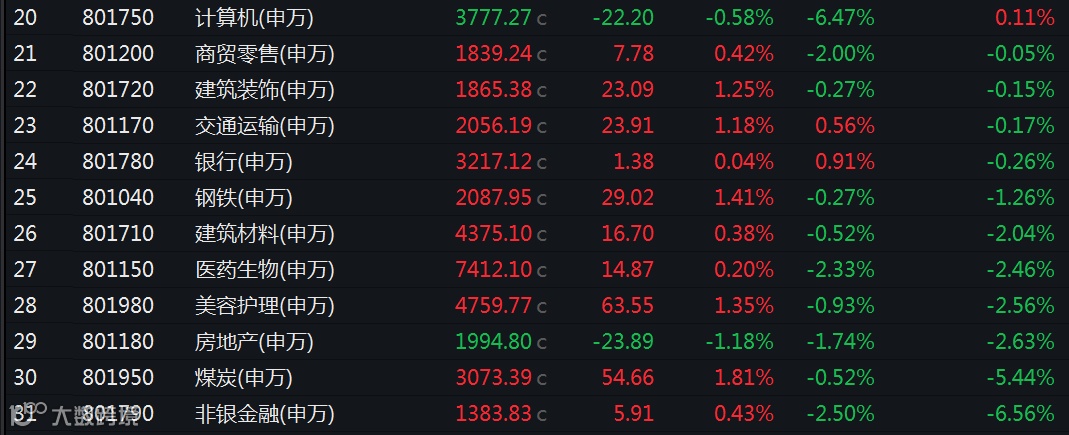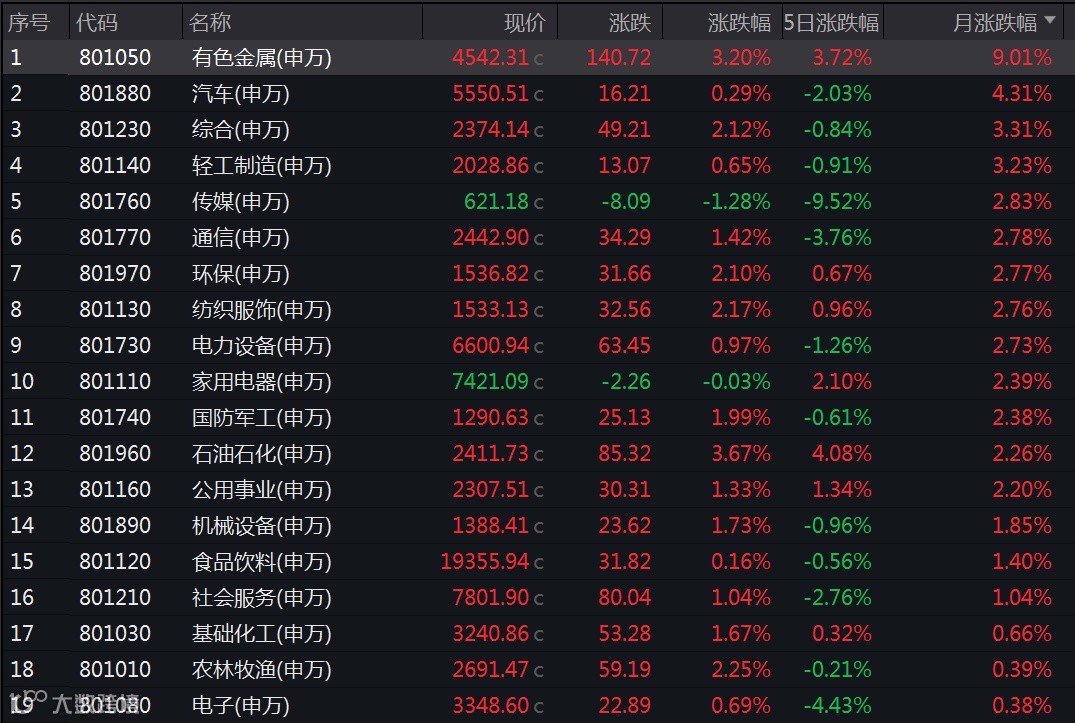 Wind数据显示,3月份,申万一级31个行业中,有色金属、汽车、综合行业涨幅居前,分别上涨9.01%、4.31%、3.31%,轻工制造行业也涨逾3%;非银金融、煤炭、房地产行业跌幅居前,分别下跌6.56%、5.44%、2.63%,美容护理、医药生物、建筑材料行业也均跌逾2%。