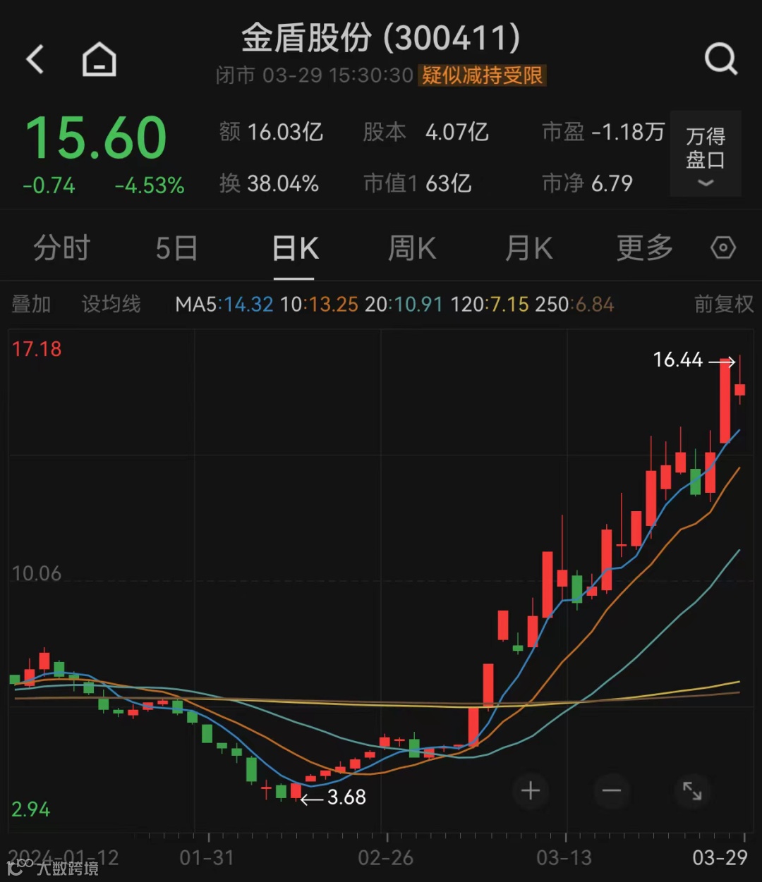涨幅最大的金盾股份3月累计上涨200%,总市值从21.14亿元增长至63.42亿元,期间出现5次20%涨停,其中3月5日至3月7日连续3个交易日涨停。金盾股份3月28日晚间发布股票交易异常波动暨风险提示公告表示,公司与清华大学合作的飞行汽车电动涵道风扇产品目前还处于研发阶段,尚未应用,公司特别提醒投资者,注意投资风险,理性决策,审慎投资。此外,金盾股份还发布了董事、副总经理陈根荣计划于2024年4月18日至2024年10月18日减持不超813.04万股,占公司总股本2.0%的减持公告。