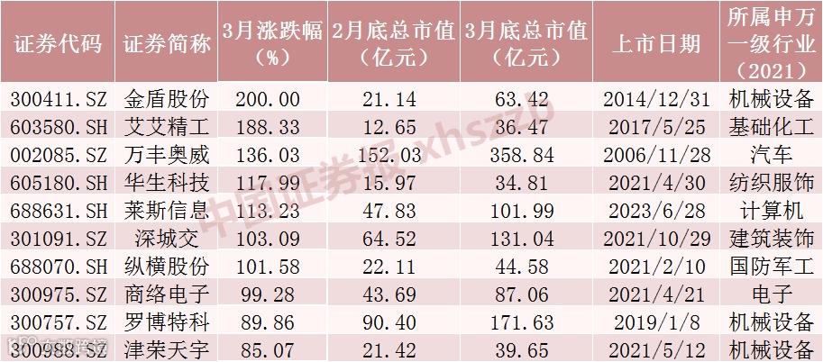 3月十大牛股分别为金盾股份、艾艾精工、万丰奥威、华生科技、莱斯信息、深城交、纵横股份、商络电子、罗博特科、津荣天宇