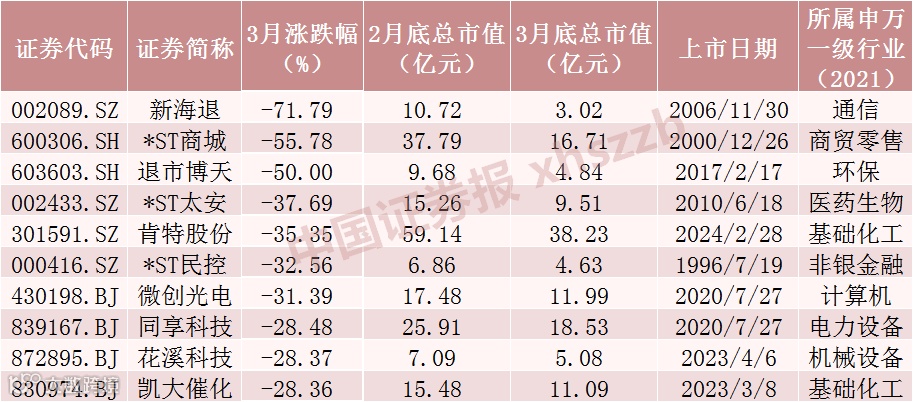 其中,跌幅最大的新海退3月累计下跌71.79%,3月26日为新海退进入退市整理期的起始日。