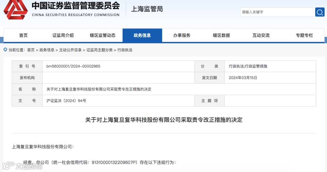 上海证监局表示,上述隐瞒负债、虚假平账、不当会计确认等行为,导致公司披露的2013年-2023年期间的定期财务报告存在虚假记载,违反了《上市公司信息披露管理办法》和《上市公司信息披露管理办法》相关规定。上海证监局决定对复旦复华采取责令改正的监督管理措施。