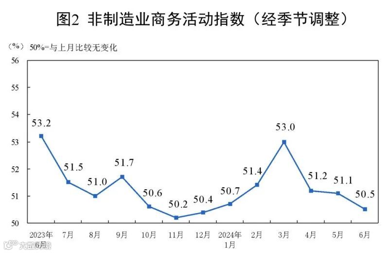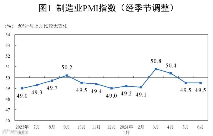 国家统计局6月30日发布数据显示,6月份,制造业采购经理指数(PMI)为49.5%,与上月持平;非制造业商务活动指数和综合PMI产出指数均为50.5%,分别比上月下降0.6和0.5个百分点。