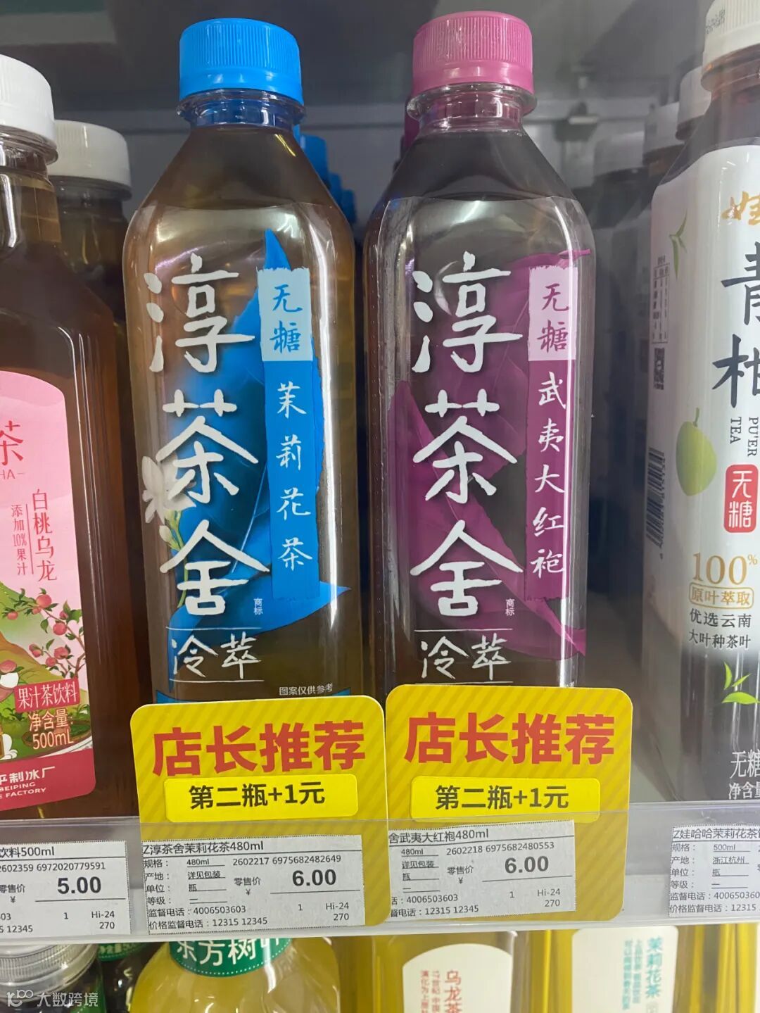 记者观察到,在线下零售端,无糖茶产品已经从6-8元价格带下移至3元水平。在线下超市,记者看到,虽然目前各大品牌无糖茶产品零售价仍在5元左右,但相关产品促销优惠力度较强。以可口可乐的淳茶舍为例,货柜上显著标明,单瓶售价6元,但购买第二瓶只需加1元,照此计算单瓶售价为3.5元。农夫山泉东方树叶标准500ml装价格为5.5元,900ml装则打出了12元两瓶的促销政策。这样的优惠模式在该店无糖茶产品上比比皆是。