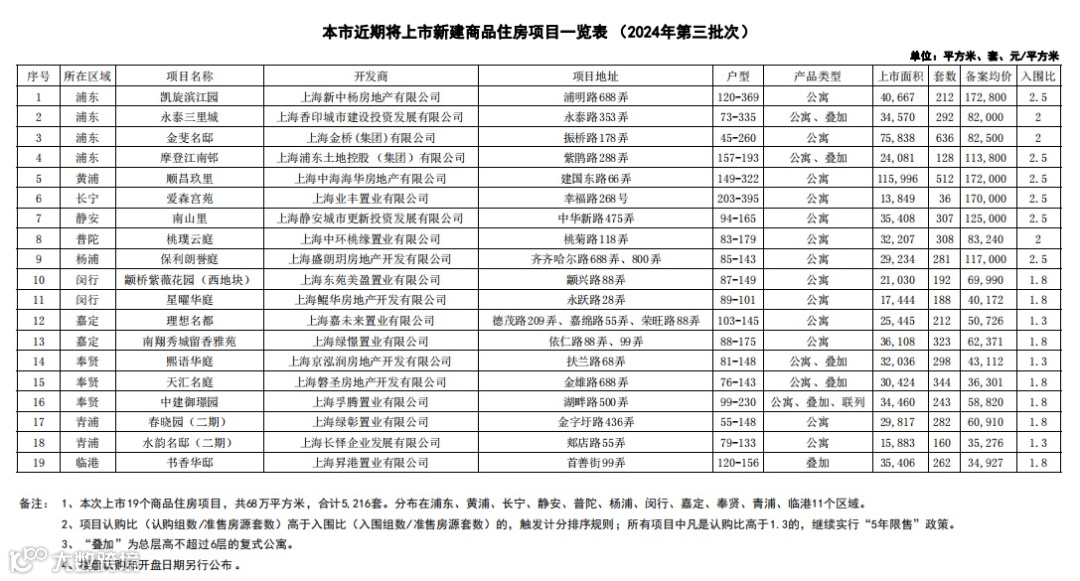 3月3日,上海今年第三次以集中批量供应的方式推出房源。该批房源共涉及19个项目,总建筑面积约68万平方米,共计5216套,备案均价96386元/平方米,分布在浦东、黄浦、长宁、静安、普陀、杨浦、闵行、嘉定、奉贤、青浦、临港11个区域。