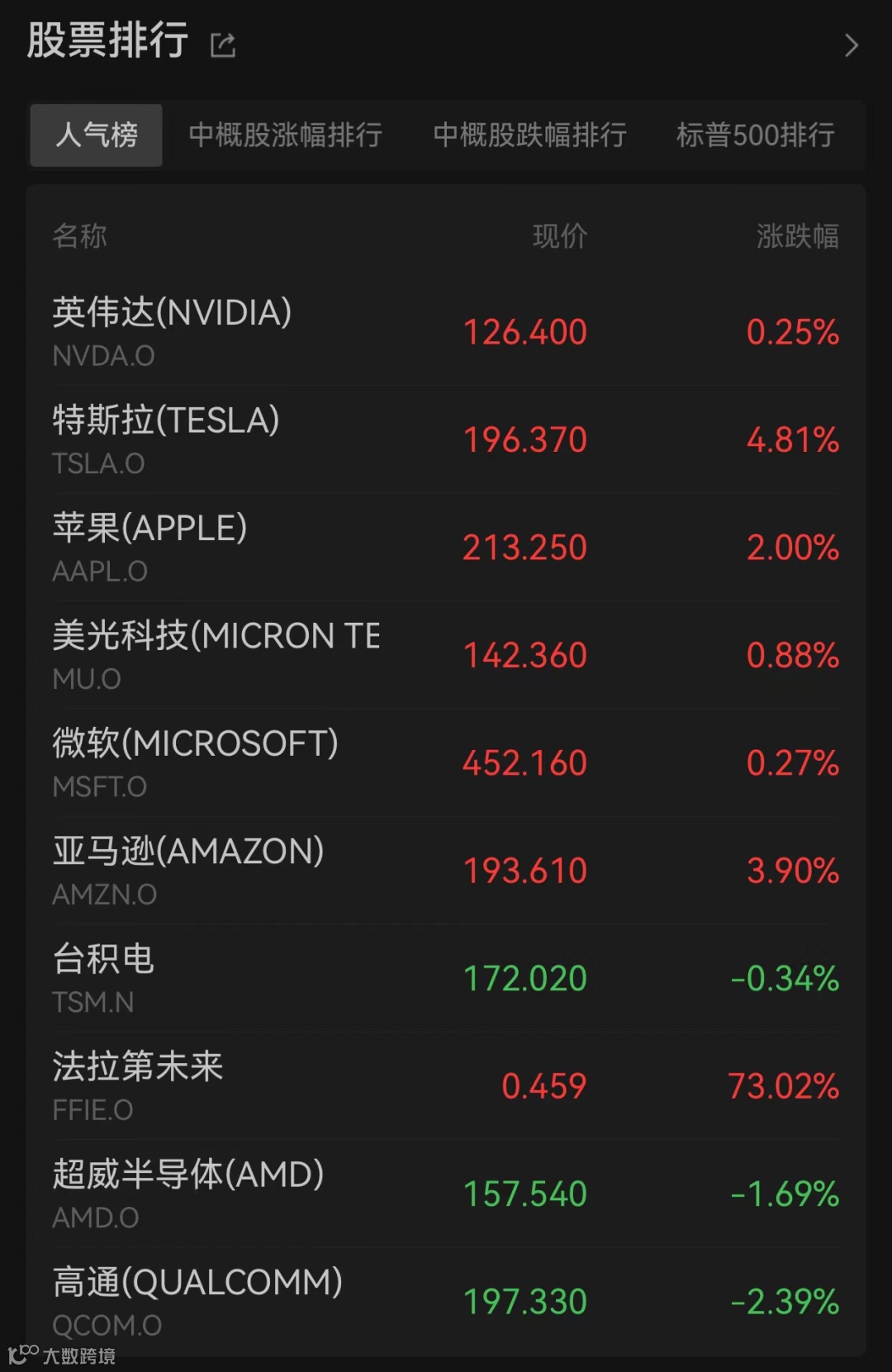 法拉第未来上涨73.02%,盘中一度涨逾120%,最新市值为2亿美元。