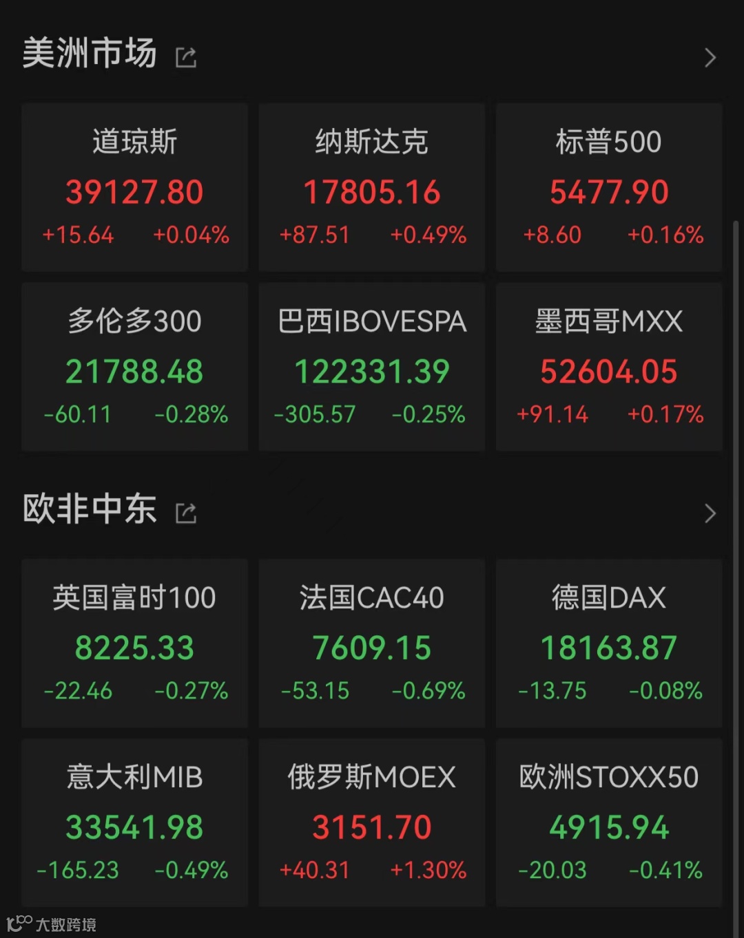 美股市场三大指数低开高走,截至收盘,道琼斯工业指数、纳斯达克指数、标普500指数分别上涨0.04%、0.49%、0.16%。
