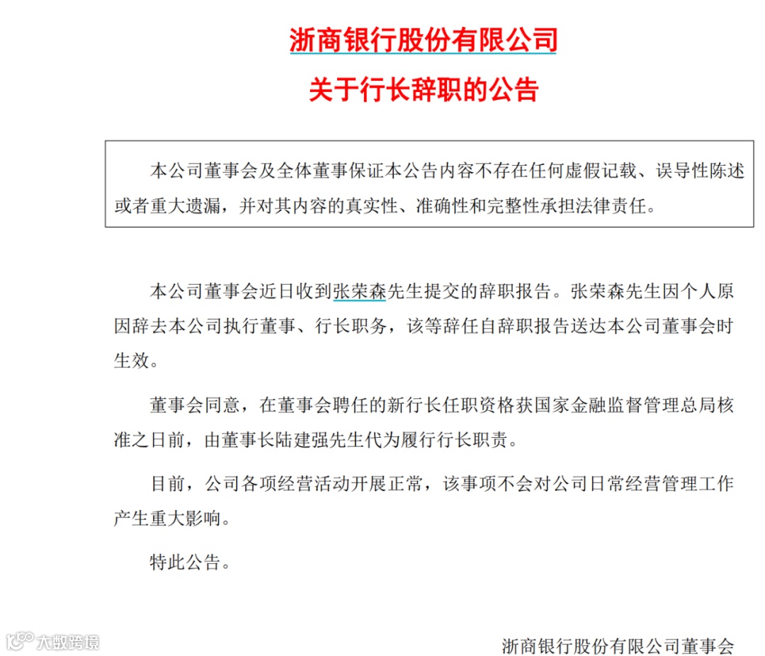 8月18日,浙商银行发布公告称,该行董事会近日收到行长张荣森提交的辞职报告。张荣森因个人原因辞去浙商银行执行董事、行长职务,辞任自辞职报告送达浙商银行董事会时生效。