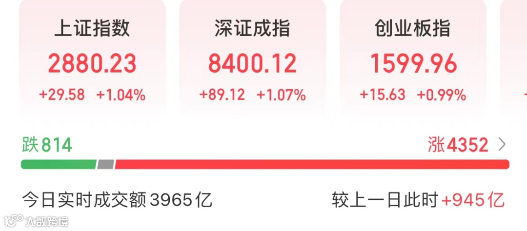 今天早盘,上证指数最低探至2839.39点,创本轮调整新低。这个时候,多只沪深300ETF集体大幅放量,市场随即持续拉升,截至上午收盘,上证指数上涨1.04%,深证成指上涨1.07%,创业板指上涨0.99%。上午市场成交额为3965亿元,较昨日上午增加945亿元。