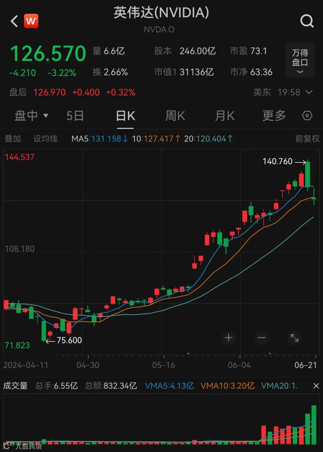英伟达在美股开盘后一度下跌近5%。截至上周五收盘,英伟达下跌3.22%,报收126.57美元/股,市值3.11万亿美元。相比当地时间6月18日的市值高峰3.34万亿美元,经过6月20日和6月21日两日下跌,英伟达市值已蒸发超2200亿美元。