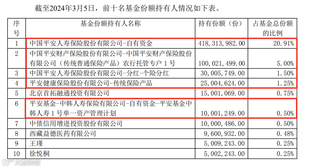 其中,摩根中证A50ETF的第一、第二、第四、第十大持有人分别为太平洋人寿(个人分红)、国华人寿(分红二号)、太平洋人寿(个人万能)、中国人寿再
