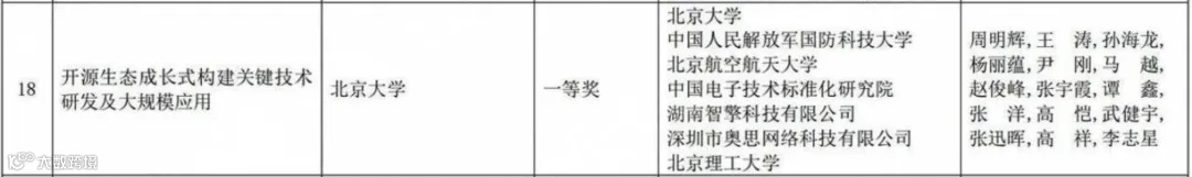 开源中国子公司北京奥思研工智能科技有限公司(原深圳市奥思网络科技有限公司)作为参与单位,与北京大学、中国人民解放军国防科技大学、北京航空航天大学、中国电子技术标准化研究院、湖南智擎科技有限公司、北京理工大学携手合作完成的《开源生态成长式构建关键技术研发及大规模应用》项目获得了“科学技术进步奖”一等奖。
