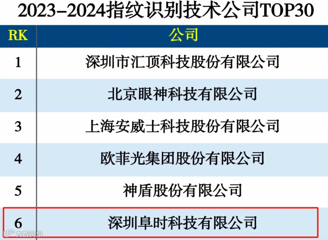 阜时科技荣登2023-2024指纹识别技术公司TOP30,位列第六;登榜“2024人脸识别技术公司TOP25”榜单。