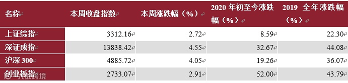 本周上证综指收涨2.72%报3312点,深证成指收涨4.55%报13838点,沪深300收涨4.05%报4885点,创业板指收涨2.91%报2733点。