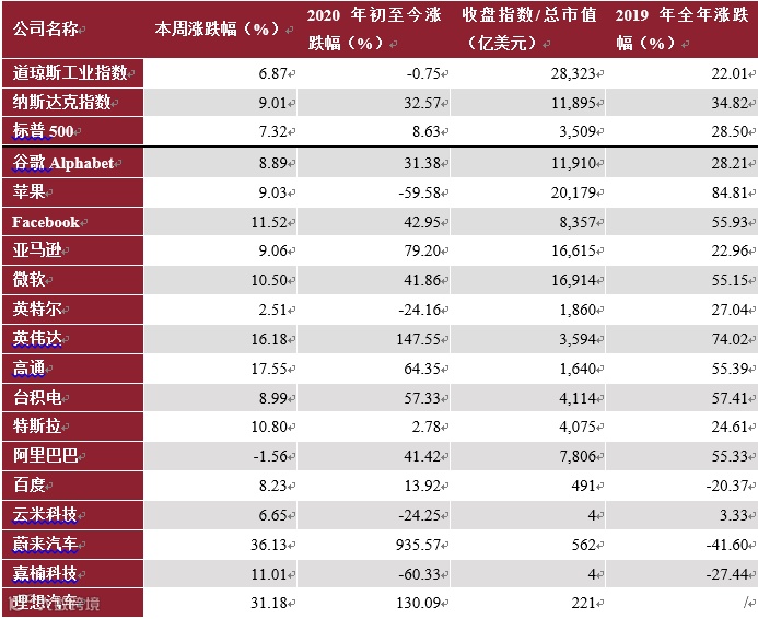 同时,我们分别追踪跨市场指数和个股行情动态,对于上市公司,暂时选择了最具代表性的16只美股及8只港股。