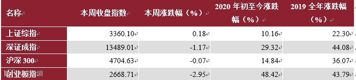 本周上证综指收涨0.18%报3360点,深证成指收跌1.17%报13489点,沪深300收跌0.07%报4704点,创业板指收跌2.95%报2668点。