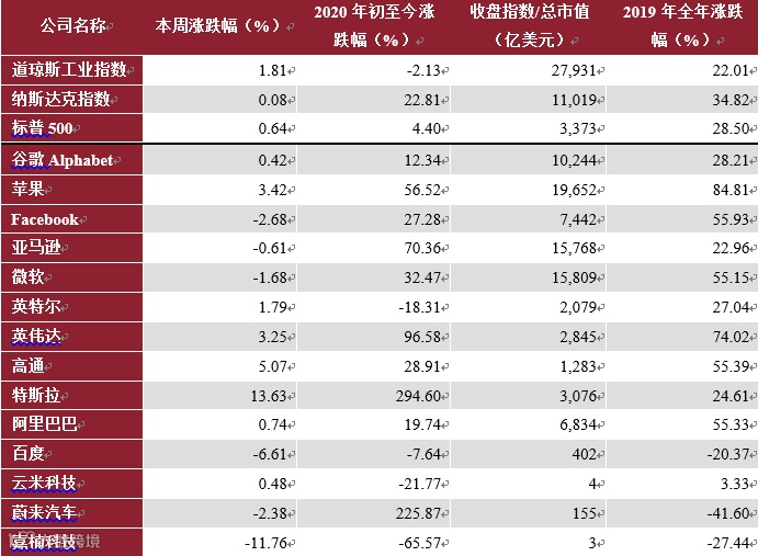 同时,我们分别追踪跨市场指数和个股行情动态,对于上市公司,暂时选择了最具代表性的14只美股及8只港股。