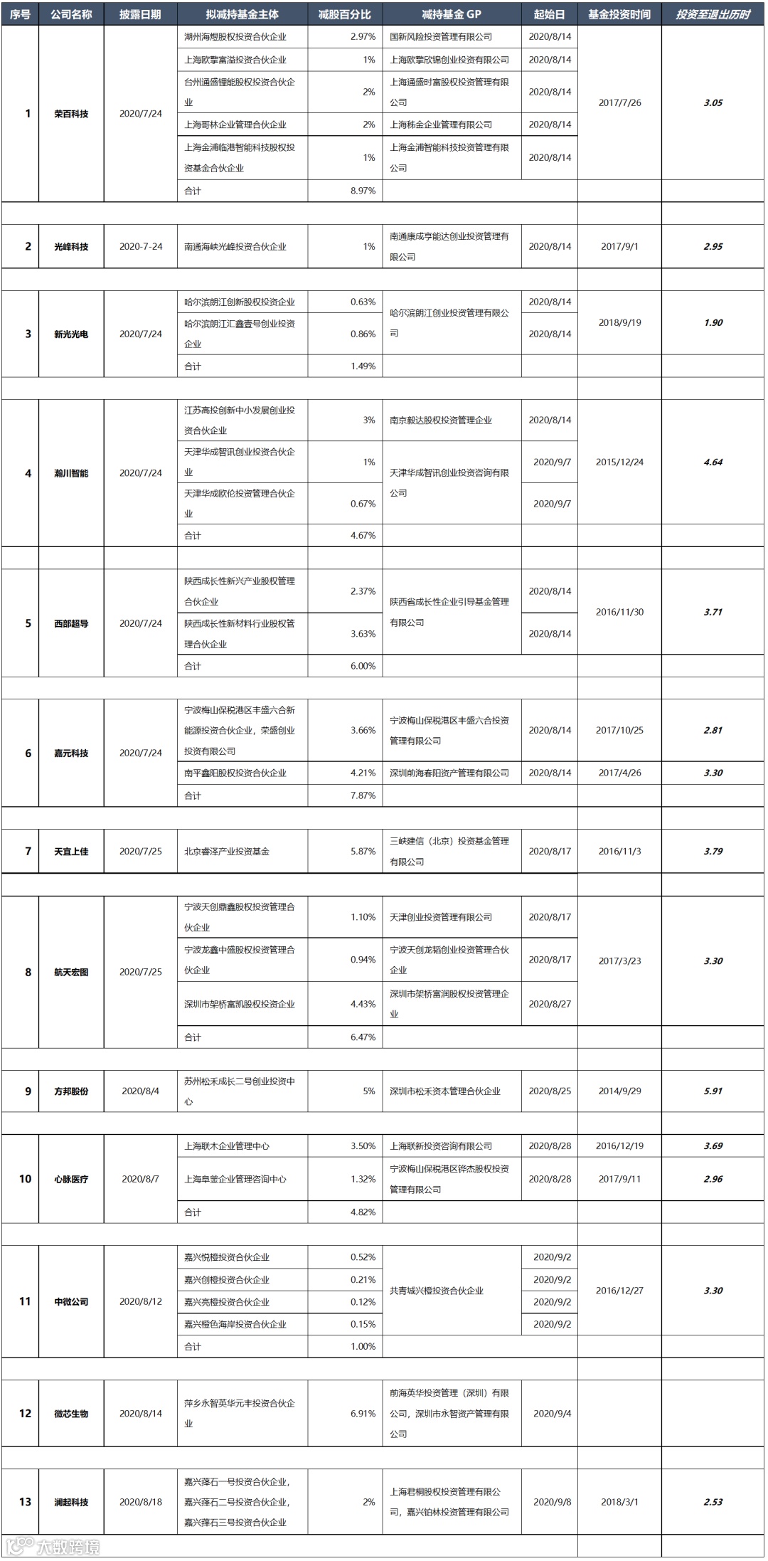 从期限上看,我们公告中明确的减持起始日(该日起股东可在二级市场直接抛售减持)作为退出日。上述13家企业合计30支基金对于上市项目的投资期限普遍在3年至5年间,平均为3.4年。其中最快的星光光电股东—哈尔滨朗江创新股权投资企业(有限合伙)仅用了1.95年。也有方邦股份股东松禾创投二号基金通过近6年的长跑最终实现了项目的高回报(松禾2号是VC基金,预计投资成本较低,回报同样喜人)。