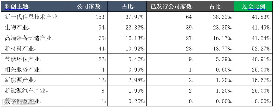 新一代信息技术、生物医药以及高端制造作为老三样始终引领其他新兴产业领域,是科创板上市热门板块。值得注意的是新材料板块快速追赶,且拥有最高的过会比例(已受理的企业中完成证监会注册的比例)。