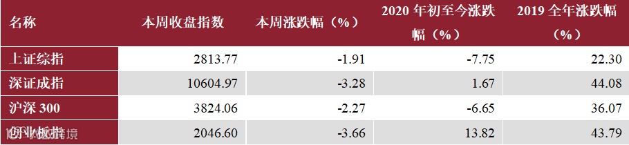 本周上证综指收跌1.91%报2813点,深证成指收跌3.28%报10604点,沪深300收跌2.27%报3824点,创业板指收跌3.66%报2046点。