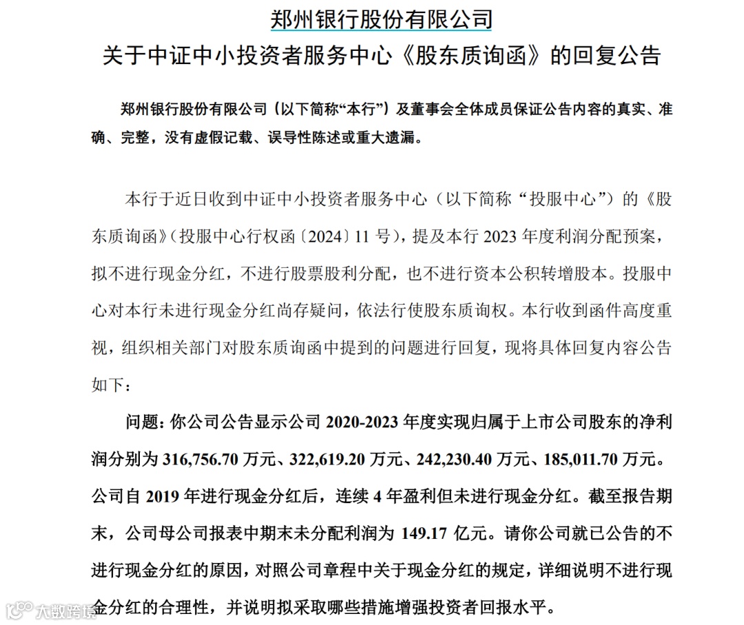 投服中心指出,郑州银行公告显示,该行在2020-2023年度实现归属于上市公司股东的净利润分别为31.68亿元、32.26亿元、24.22亿元、18.50亿元。郑州银行自2019年进行现金分红后,连续4年盈利但未进行现金分红。