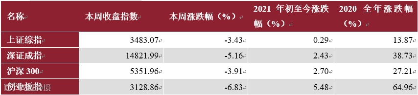 本周上证综指收跌3.43%报3483点,深证成指收跌5.16%报14821点,沪深300收跌3.91%报5351点,创业板指收跌6.83%报3128点。