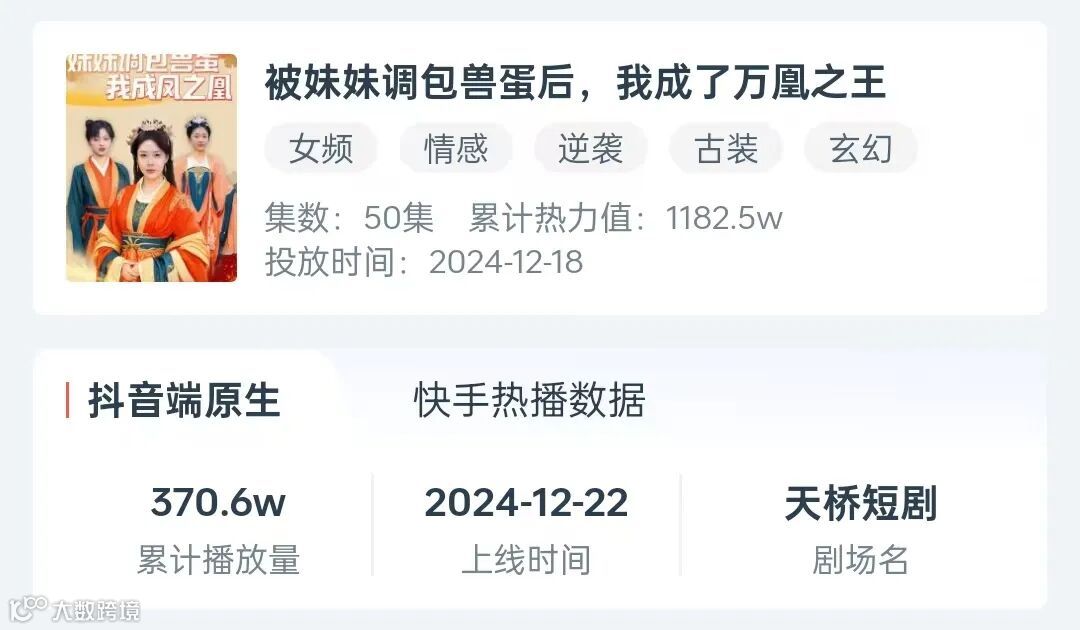 《被妹妹掉包兽蛋后,我成了万凰之王》由天桥自制推出,共50集,自12月18日上线至今,累计热力值1182.5w。(以下简称本剧为《万凰之王》)