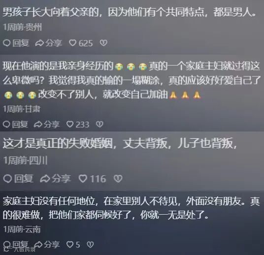 亲近的人捅的刀往往最深、最痛,亲生儿子都如此轻视自己,可想而知,女性,尤其是当了家庭妇女的中年女性,境况有多悲哀!