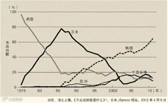 1980年,日本攻下30%的半导体内存市场,5年后,日本的份额超过50%,美国被甩在后面。