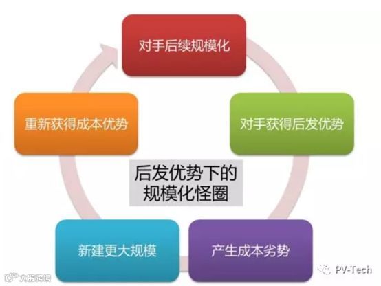 但是,在“规模效应”之外,还有一个“后发优势”:企业在规模化扩产之后,很快就将面临新进入或新扩产者的挑战。相比前期扩产企业,新扩产者往往可以获得更低设备成本(发展期,行业设备迭代优化速度很快,光伏行业尤为明显)、更低人工成本(新扩产项目,往往建在人工成本更低的地区),更低研发成本(后来者可以借鉴前者经验,减少研发成本、避免研发风险),由此而拥有更大的后发竞争优势。