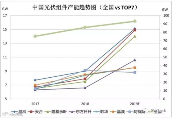 面对市场竞争,大多数大型光伏企业都不约而同的选择进一步加大投入,以量取胜,走规模化发展之路。以组件为例:2017年,光伏组件TOP7的企业,产能都处于5GW级别(4.3-6.5GW);2018年,top7中4家企业就已经扩张到了接近10GW级别(8.5-9GW);到了2019年,TOP7企业继续加速扩张,分别达到了15GW(晶科、天合、乐叶)、10GW(东方日升、韩华、晶澳、阿特斯)产能规模。另有爱康等新后起之秀,更是以每年超100%的速度迅猛扩张。爱康通过赣州、长兴生产基地扩产,以及并购中的越南光伏等实现了产能的爆发式增长。