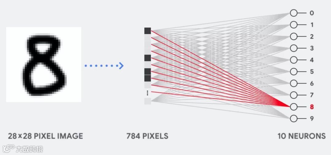 如果图像为 28×28 像素的灰度图,那么它可以转化为包含 784 个元素的向量。神经元会接收所有 784 个值,并将它们与参数值(上图红线)相乘,因此才能识别为「8」。其中参数值的作用类似于用「滤波器」从数据中抽取特征,因而能计算输入图像与「8」之间的相似性: