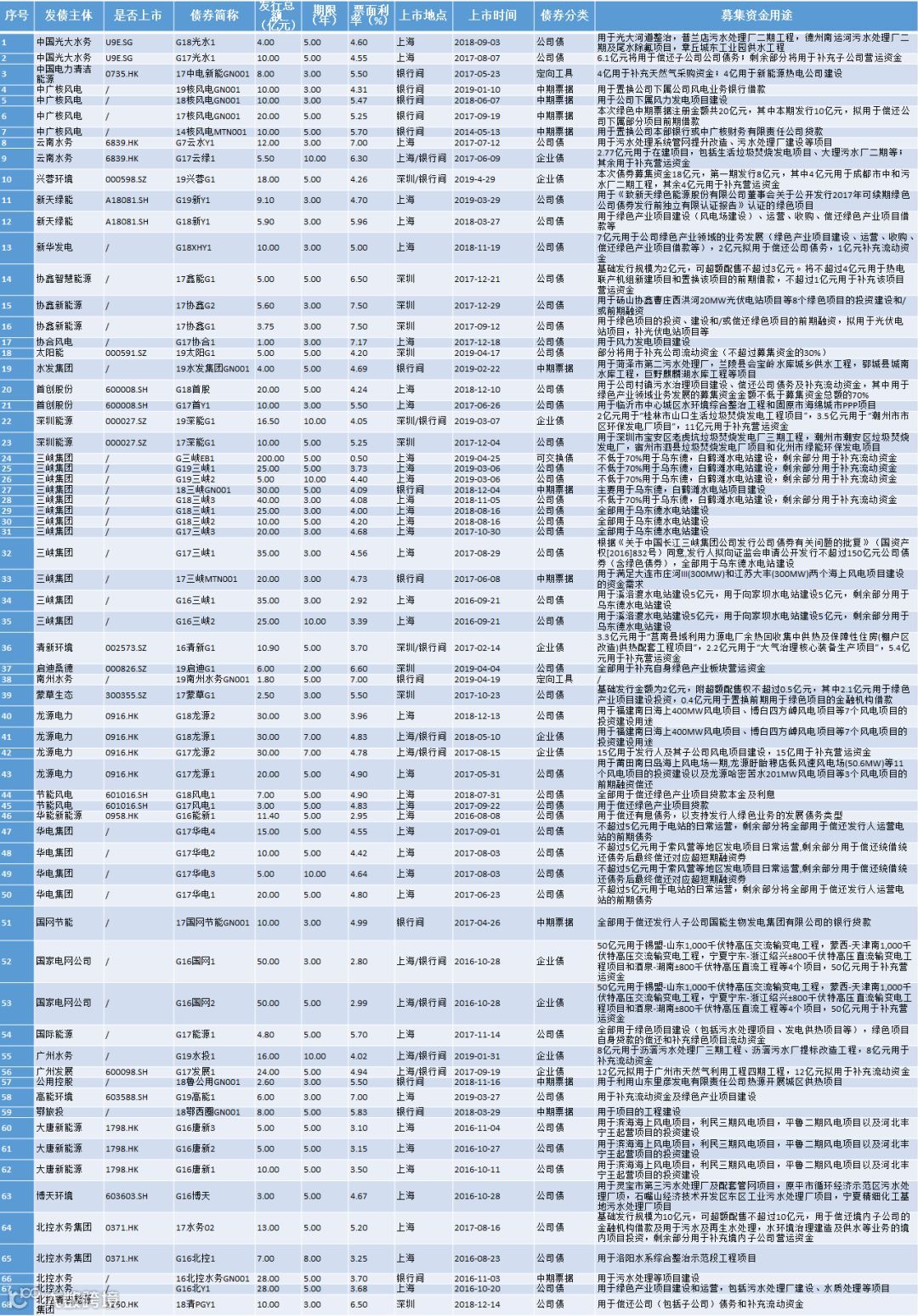截至2019年4月25日,市场存续绿色债券合计68只,发债主体共36家(上市公司20家,其中港股上市公司15家),发债总额为1,168亿元,资金用途多样涵盖绿色项目建设、置换前期贷款、补充运营资金等,具体如下: